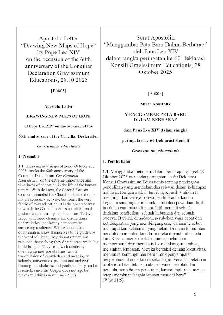 The Apostolic Letter Drawing New Maps of Hope by Pope Leo XIV reaffirms the Catholic educational mission as an expression of the Gospel that shapes the human person in fullness. It addresses modern challenges such as digitalization, inequality, and ecological crises, calling for renewed formation, global collaboration, and spiritual accompaniment. The Pope invites all educational communities to foster hope through dialogue, creativity, and service for human dignity and the common good.