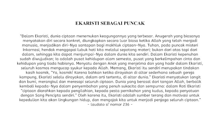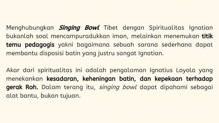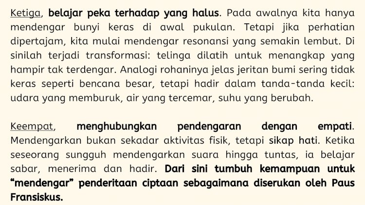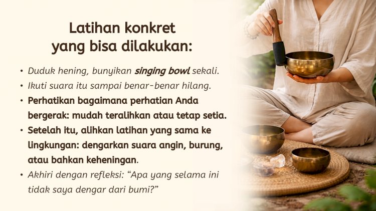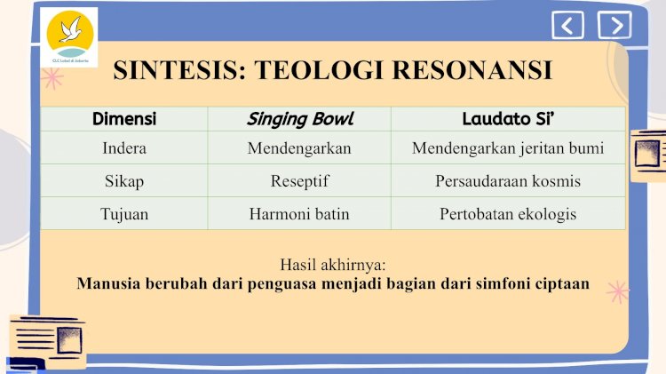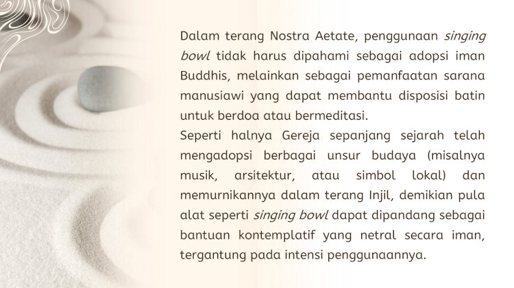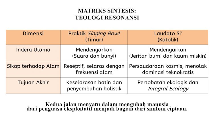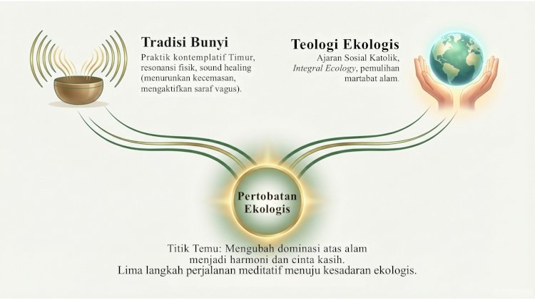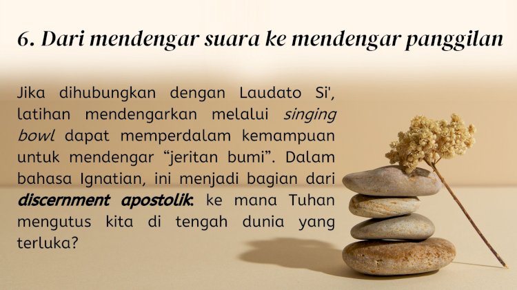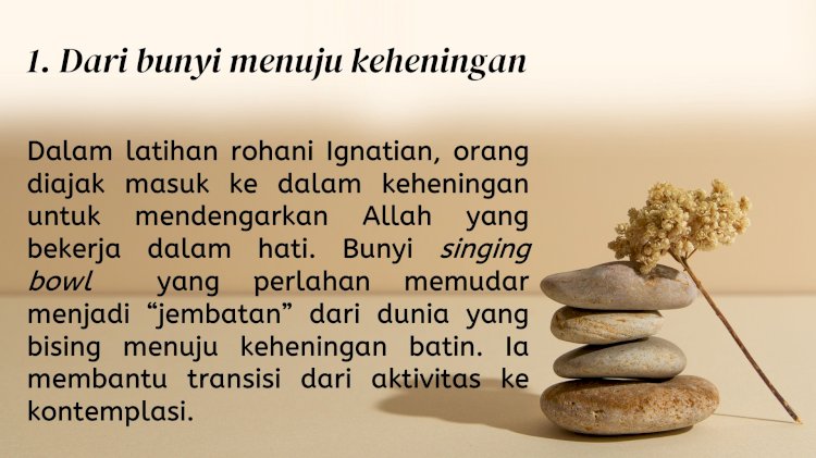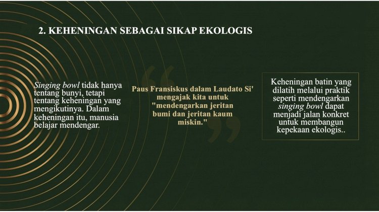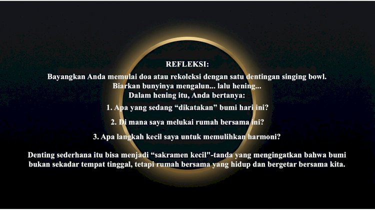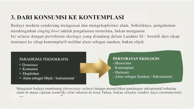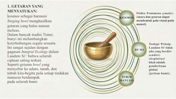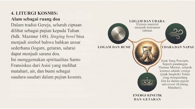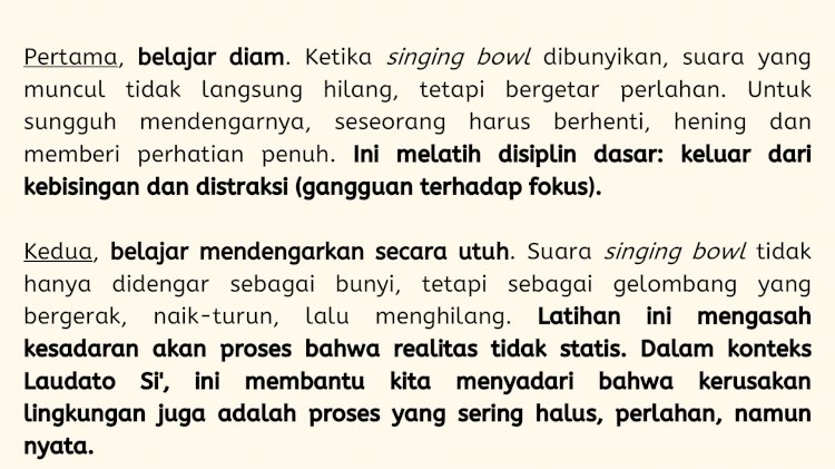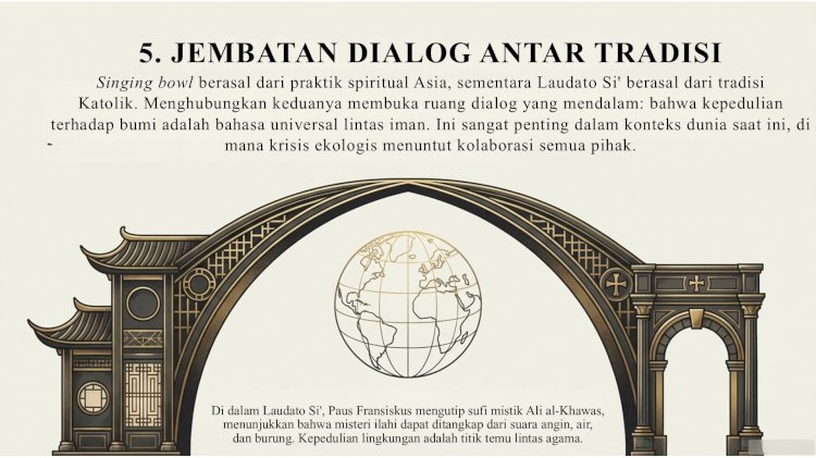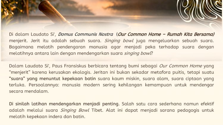 Dokumen ini mengeksplorasi integrasi penggunaan singing bowl sebagai sarana meditasi dan latihan keheningan bagi umat Katolik untuk meningkatkan kepekaan batin terhadap "jeritan bumi" dalam semangat ekologi integral Laudato Si' dan dialog antaragama sesuai dokumen Nostra Aetate.